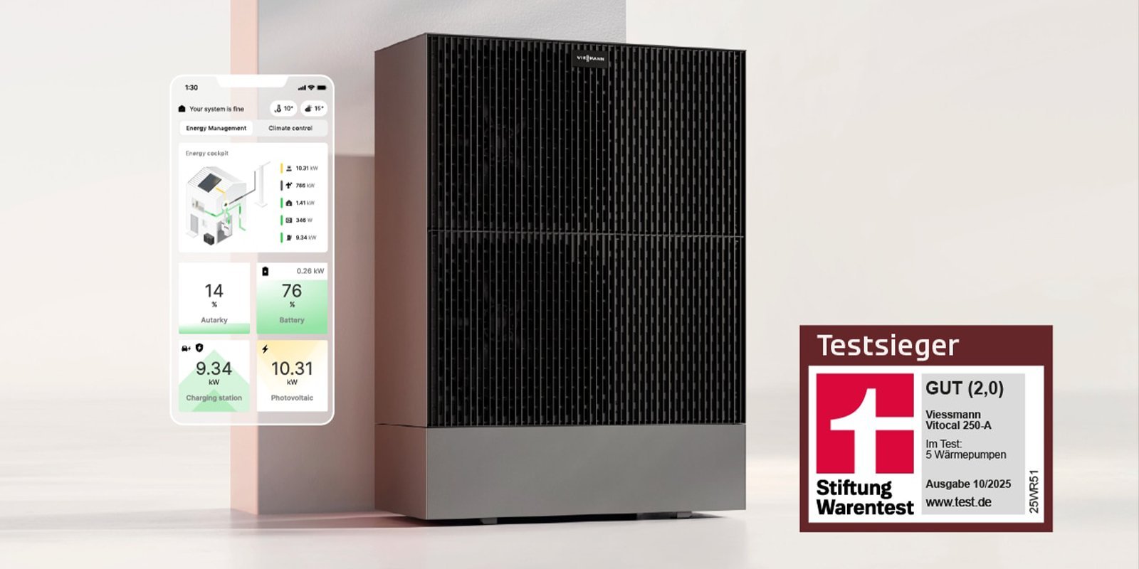 Die Luft-Wasser-Wärmepumpe Vitocal 250-A von Viessmann überzeugt erneut bei Stiftung Warentest (Ausgabe 10/2025) als Testsieger mit dem Urteil „GUT (2,0)“. Sie punktet durch höchste Effizienz, flüsterleisen Betrieb, smarte Steuerung per App und einfache Bedienbarkeit.