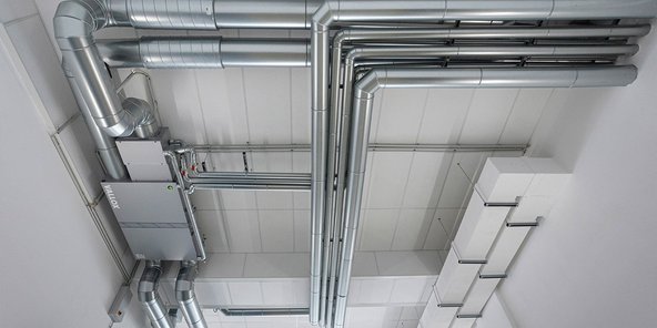 Für frische Luft und niedrige Betriebskosten sorgen zentrale VARIO Lüftungsgeräte mit Wärmerückgewinnung von VALLOX. Die geschossweise installierten Geräte aus der Commercial Line wurden mit Heiz- und Kühlregistern ausgestattet. So harmonieren sie energetisch mit den Heiz- und Kühldeckensegeln, die mit Fernwärme betrieben werden. Die effiziente Technik ist bewusst sichtbar an der Decke installiert – für einen modernen Industrie-Look.